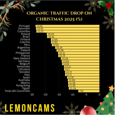 On Christmas Eve, 2025, Lemoncams saw a -7.81% global drop in its organic traffic. However, this holiday doesn’t impact the celebrations worldwide and thereby traffic in a similar way. Strongest contractions on Lemoncams were seen from Portugal, Denmark and Colombia, with -23.62%, -23.45% and -23.32% decline, respectively.