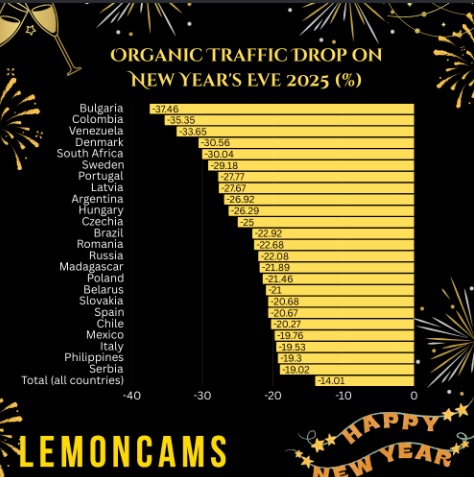 New Year’s Eve, as per last year’s data from Lemoncams, has proved to be one of the most definitive events of the year. It showed a -14.01% global drop in traffic—which was almost double the seen Christmas effect. This decline was quite severe across Latin America and Europe, with Colombia, Bulgaria and Venezuela, with -35.35%, -37.46% and -33.65% leading.